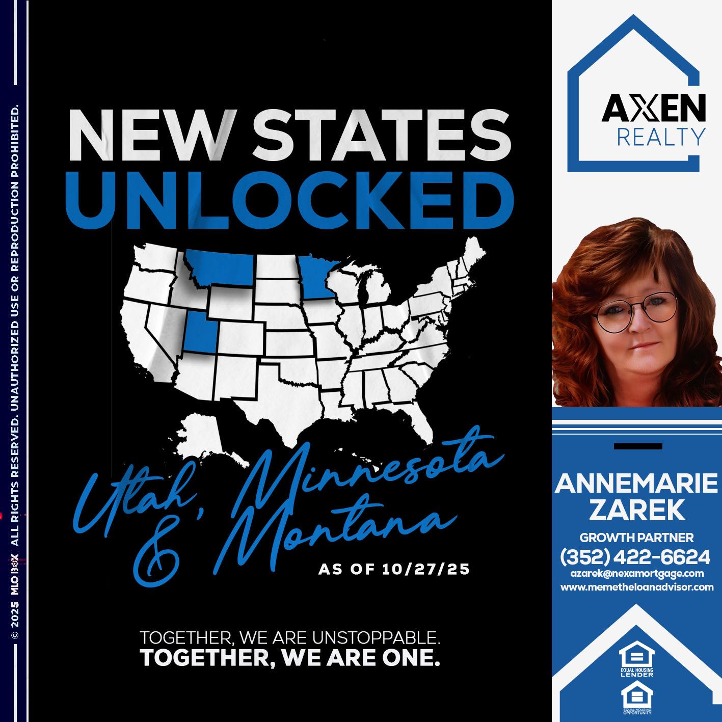 new states unlocked - AnneMarie Zarek -Mortgage Loan OriginatorHi, my name is AnneMarie Zarek. I’m a Loan Officer with NEXA Mortgage LLC., offering personalized mortgage solutions, fast customized quotes, great rates and service with integrity.
